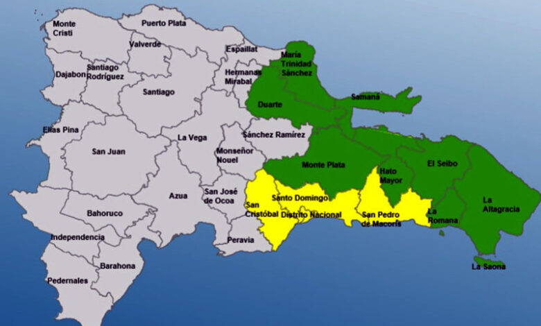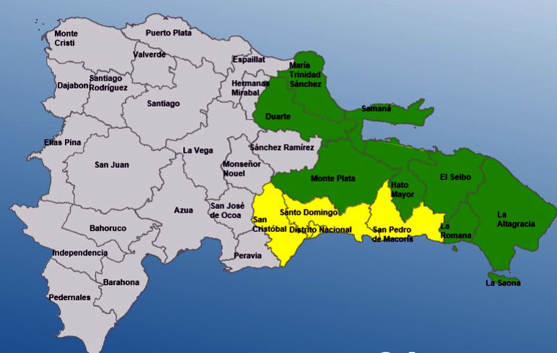 Mientras en alerta verde se mantienen Duarte, María Trinidad Sánchez, Samaná, El Seibo, Hato Mayor, La Altagracia, La Romana y Monte Plata.