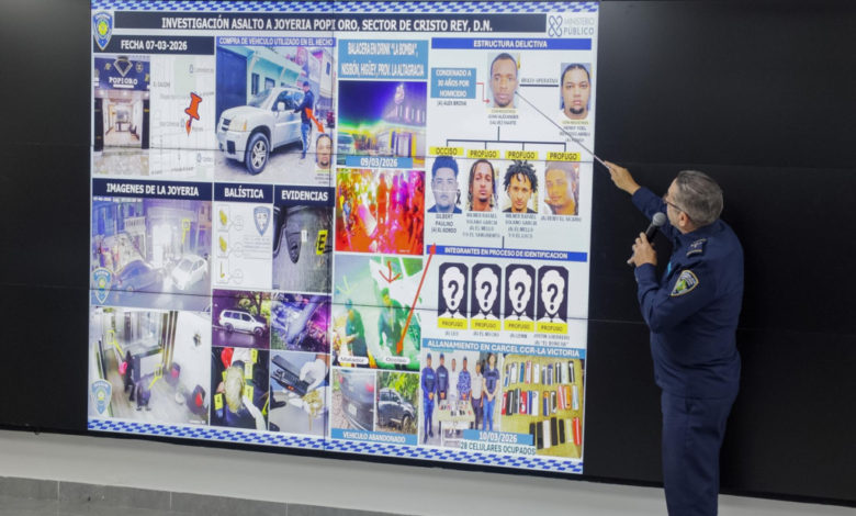 La Policía Nacional, en coordinación con el Ministerio Público, logró avances significativos en la investigación del asalto a mano armada perpetrado contra la joyería Popi Oro, ubicada en el sector Cristo Rey, Distrito Nacional, con la detención de dos de los presuntos autores, la identificación de otros implicados y la recolección de múltiples evidencias que fortalecen el proceso investigativo.