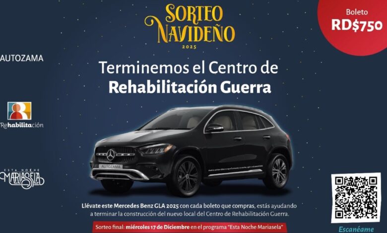 SANTO DOMINGO, RD.- Rehabilitación anunció el inicio de la venta de boletos para su tradicional Sorteo Navideño, que este año tiene como atractivo una jeepeta Mercedes Benz GLA 2025, donada por Autozama y valorada en US$70,000, iniciativa que busca recaudar fondos para culminar la construcción del nuevo local del centro de Guerra.